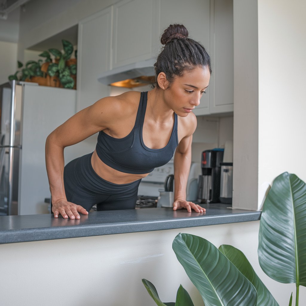 Place your hands shoulder-width apart on the counter, step back, and lower your chest to the edge of the counter.